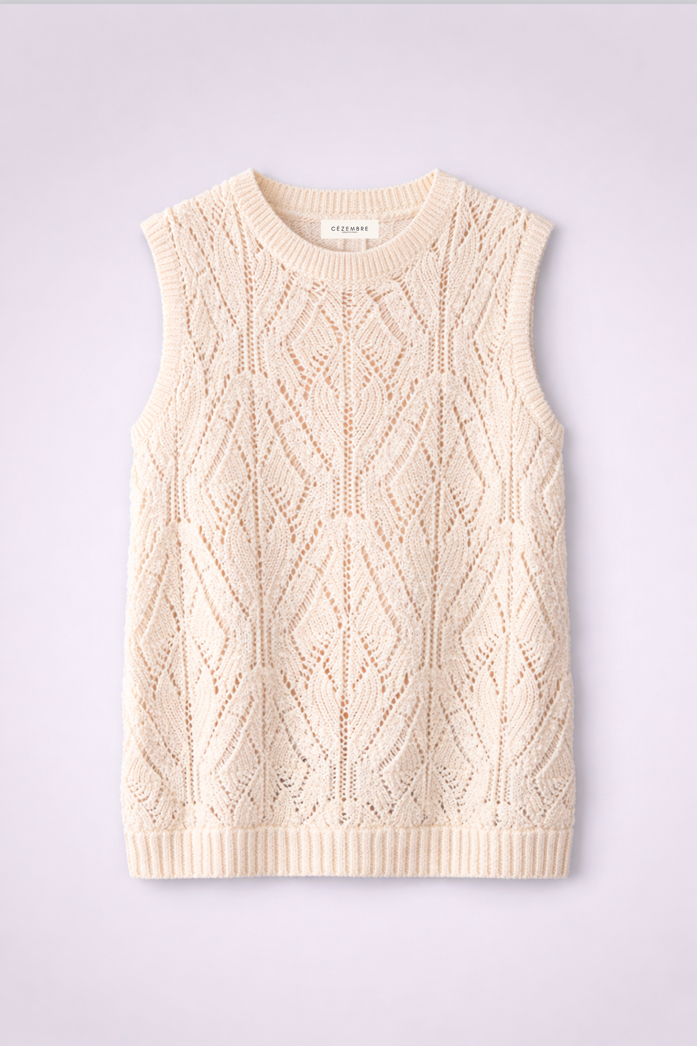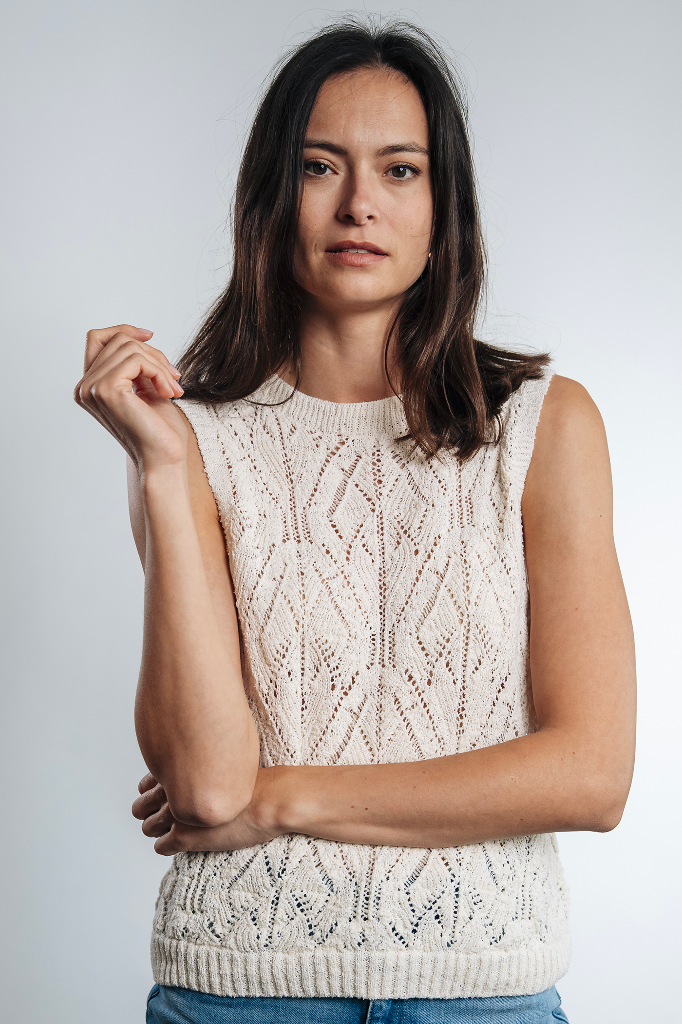 Light, graphic, and decidedly summery, the Anna sleeveless sweater adds a touch of freshness to any silhouette. Its openwork knit subtly allows the skin to breathe while offering an elegant and feminine drape.